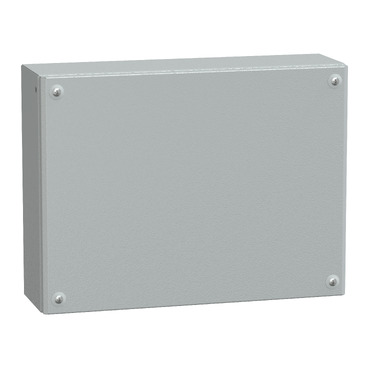 Industrijska kutija za Spacial SBM. Višenamenska. 300 x 400 x 120 mm. Kutija za ravno lice. Zid montiran na kućište. Jednodelno telo presavijeno i zavareno. Pričvršćivanje poklopca sa poluokretnim metalnim šrafom. Poklopac sa 4 zavrtnja PZ2 izvan zatvorenog prostora. Napravljen od čeličnog lima sa poliesterskim prahom. Zaštita IP 66, IK10.