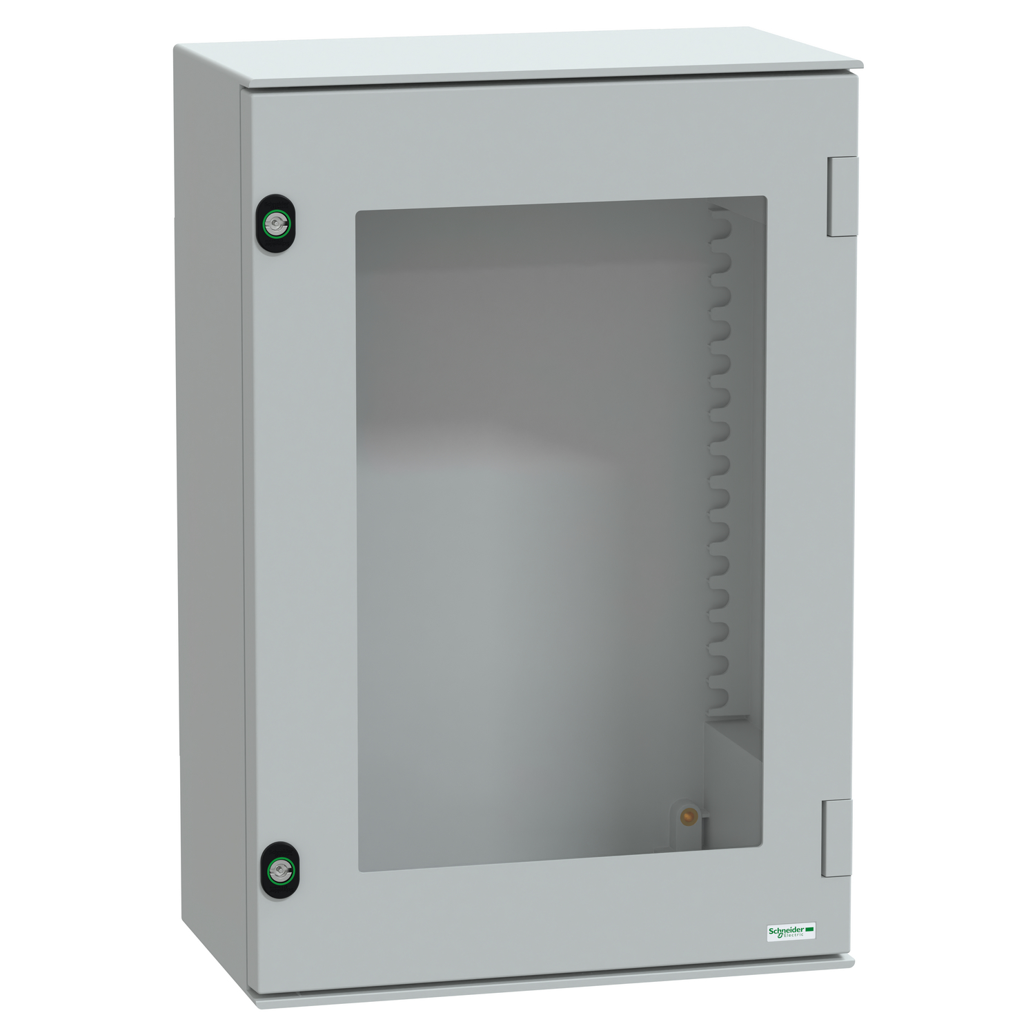 Thalassa PLM zidno kućište od poliestera sa zastakljenim vratima. 646 x 436 x 250 mm. Bez montažne ploče, ugrađena nadstrešnica. Sistem zaključavanja vrata sa 2 tačke sa bravama sa duplom šipkom od 3 mm. Poliester ojačan telom od fiberglasa. Zaštita IP 66, IK08, siva RAL 7035.