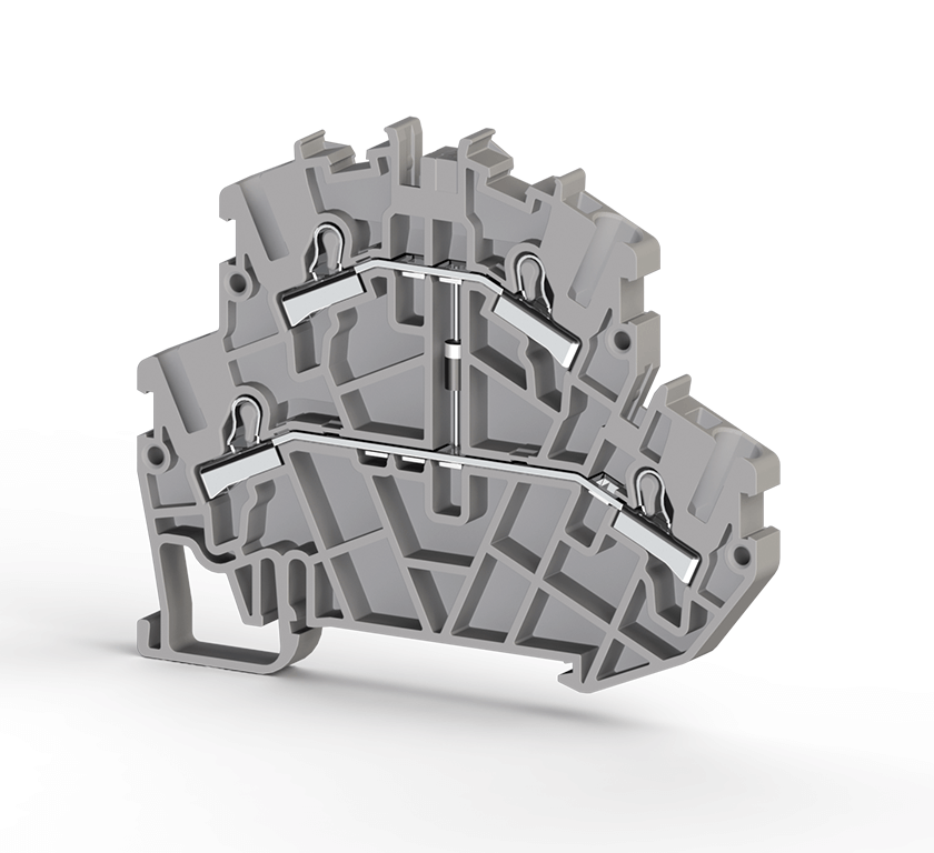 Dvoredni push-in terminal 1U/1I sa integrisanom 1N4007 diodom. Širina 5 mm, visina 75.3 mm. IP20 zaštita, kapacitet 0.34–4 mm².