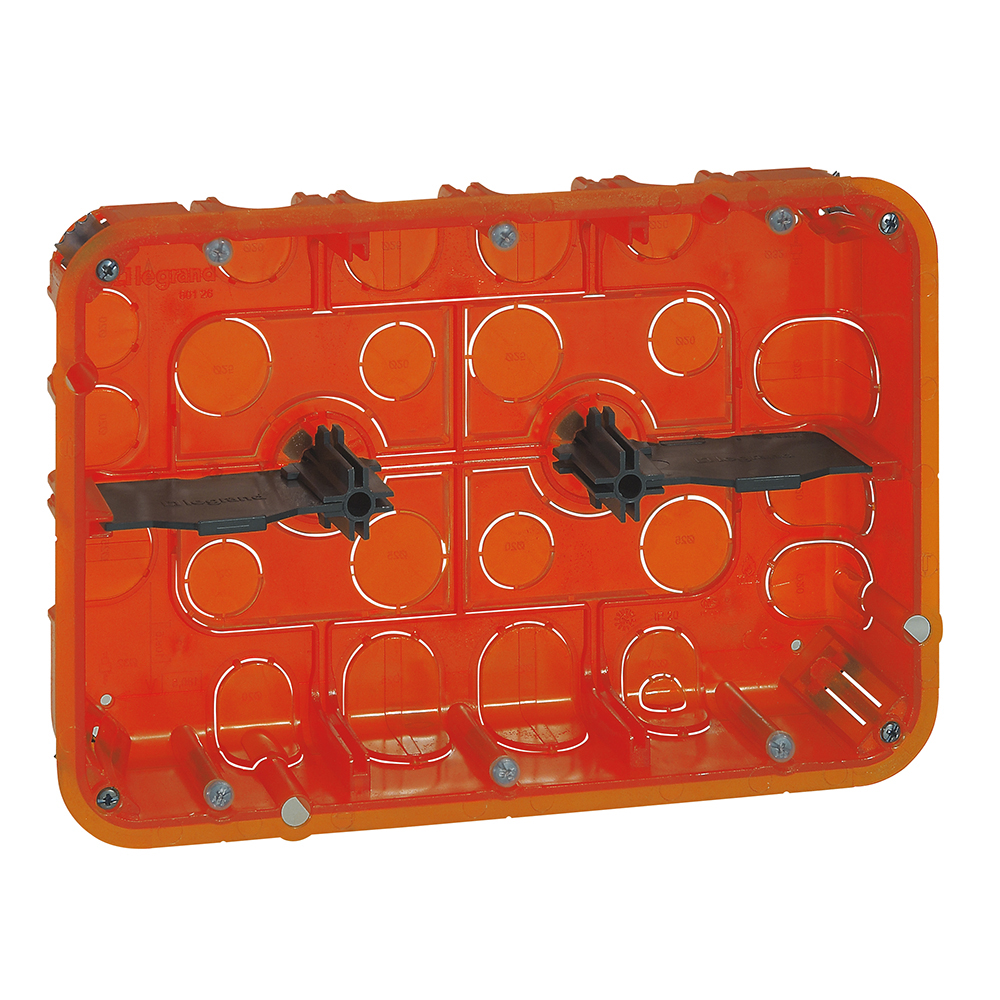 Legrand Batibox kutija za zidnu ugradnju, 3 postaje ili 6–8 modula, dubine 40 mm (080143)Kutija namenjena za montažu u zidove od pune ili šuplje cigle. Pogodna za horizontalnu i vertikalnu orijentaciju. Omogućava razdvajanje jake i slabe struje pomoću uklonjivih pregrada. Nije kompatibilna sa okruglim dozvolama 60 mm, podnim kanalima niti DIN šinama.