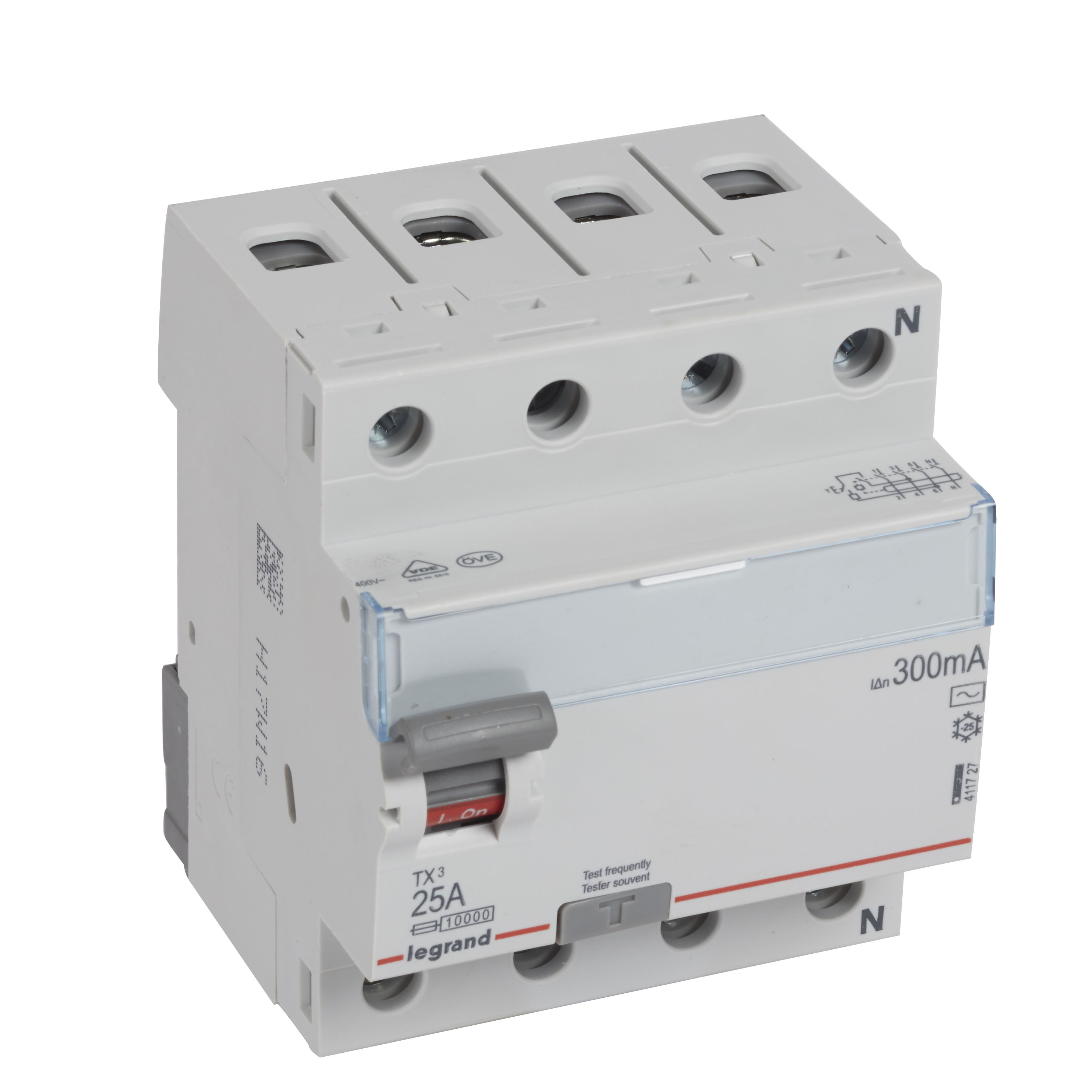 Legrand RCCB TX³ - 4P - 400 V~ - 300 mA - 25 A - AC tip je diferencijalni prekidač visokih performansi koji obezbeđuje zaštitu elektroinstalacija u trofaznim sistemima od curenja struje i opasnosti od strujnog udara. Ovaj uređaj je idealan za aplikacije u industrijskim, komercijalnim i stambenim objektima sa srednjim opterećenjem.