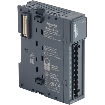 ModulTM3 - 4 analogna izlaza je deo Modicon TM3 asortimana, ponude proširenja I/O modula za Modicon M221, M241, M251 i M262. Analogni izlazni modul obezbeđuje 4 izlaza sa 11-bitnim znakom + i 12-bitnom rezolucijom. To je izlazni modul sa nominalnim naponom napajanja od 24V DC i potrošnjom struje od 125mA na 24V DC preko eksternog napajanja punog opterećenja. Ovaj proizvod može da kontroliše pogone sa promenljivom brzinom ili bilo koji uređaj opremljen strujnim ili naponskim ulazom. Postoji izolacija između izlaza i napajanja na 1500V AC, izlaza i unutrašnje logike na 500V AC. Opremljen je skidajućim navojnim terminalom za električni priključak sa podešavanjem nagiba od 5,08 mm za izlaze i napajanje. To je proizvod sa IP20 zaštitom. Njegove dimenzije su 23,6 mm (širina) x 70 mm (dubina) x 90 mm (visina). Teška je 0,115 kg. Ovaj proizvod je sertifikovan od strane CE. Ispunjava standarde EN/IEC 61131-2 i EN/IEC 61010-2-201. Ovaj modul je kompatibilan sa Modicon M262, Modicon M241, Modicon M251 i Modicon M221 logičkim kontrolerom. Podržava cilindar tipa TH35-15, šinu tipa TH35-7.5 u skladu sa IEC 60715 i ploču ili panel sa montažom kompleta za pričvršćivanje. Modicon TM3 moduli za proširenje su dizajnirani sa jednostavnim mehanizmom za spajanje. Konektor za proširenje magistrale se koristi za distribuciju podataka i napajanja prilikom sklapanja Modicon TM3 modula sa logičkim kontrolerima. Povećajte performanse svog kontrolera sa Modicon TM3 I/O sistemom specijalno dizajniranim za Modicon M221, M241 i M251 logičke kontrolere.