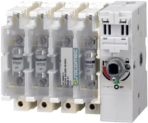 FUSERBLOC prekidač s osiguračima, 4P, 250A, za NH1 osigurače, direktna ili spoljašnja komanda, montaža na DIN šinu, IP20, visoka prekidna moć.