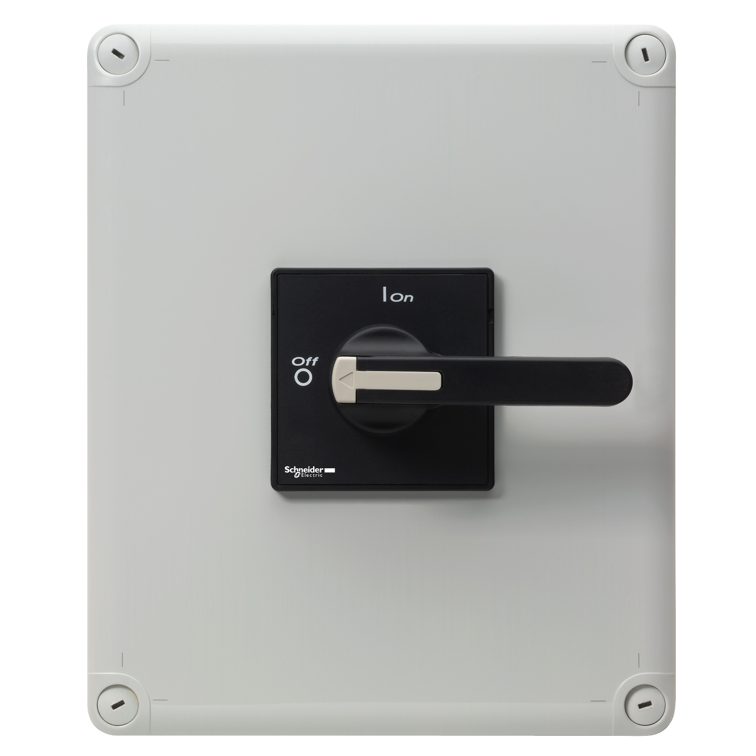 TeSys zatvoren starter sa prekidačem rastavljača, 3 pola, Ithe 100A 690V, za glavni prekidač u aplikacijama motora do 37kV@400V AC-23. Kućište sa IP65 zaštitom, opremljeno crnom dugom rotirajućom ručkom i crnom prednjom pločom, može se zaključati (katanci nisu uključeni). Uključuje 3-polno kućište Vario prekidača V5 sa 1 mogućim dodatnim modulom. Kućište za površinsku montažu sa pričvršćivanjem zavrtnjima, 2 izbočina za kablovske uvodnice na vrhu i dnu, poklopac koji se može zaptiti. Usklađen je sa IEC 60204 i IEC 60947-4-1, Green Premium usklađen (RoHS/REACh).